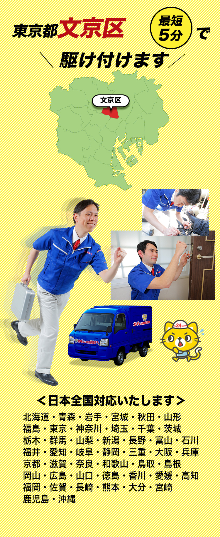 文京区の「カギの出張24時間」は本郷、小石川からのスピーディな対応をお約束。明確な事前説明と正確な見積もりで、お客様の信頼を第一に考えています。地域密着で親切丁寧なサービスを提供し、毎回の作業後にはお客様のフィードバックを活用しサービス品質の向上を図ります。
